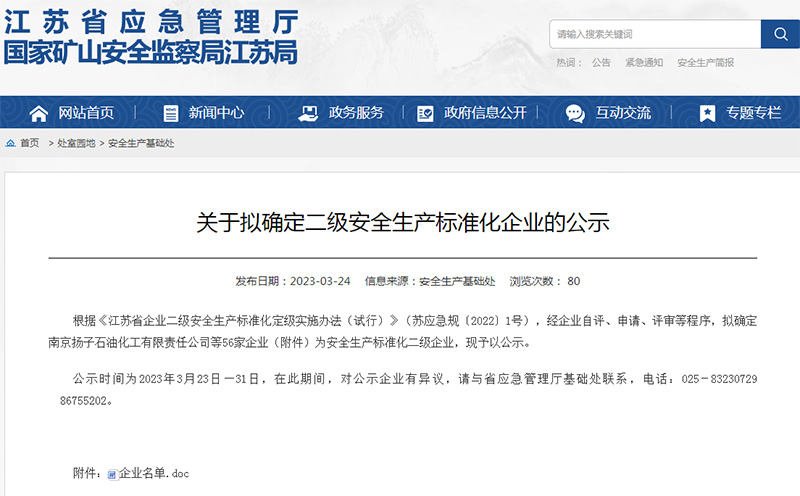后續(xù),我公司對評審組提出的不符合項按照隱患整改“五定”原則制定了整改方案并落實整改。3月1日,評審組再次組織專家對不符合項的整改開展復查,評審組確認了所有不符合項整改閉環(huán)。2023年3月24日江蘇省應急管理廳網(wǎng)上發(fā)布公示。